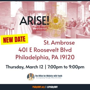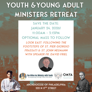 My name is Marisally Santiago, Director of the Office for Ministry with Youth of the Archdiocese of Philadelphia. I just want to say, welcome to your site! We seek to serve and support Ministers with Youth in parishes as well as be a resource for those who minister with youth through High School Campus Ministry, CYO Sports, Catholic Scouting, and movements whether as paid staff or volunteer. Here are quick links to some of our content: