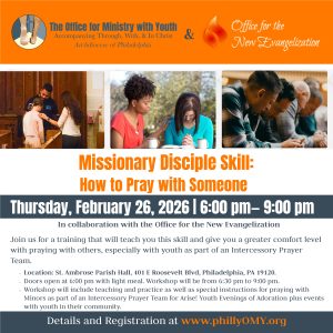 The Office for Ministry with Youth and the Office for the New Evangelization invites you to learn an important Missionary Disciple skill: How to Pray with Someone. Join us for a training that will teach you this skill and give you a greater comfort level with praying with others, especially with youth as part of […]